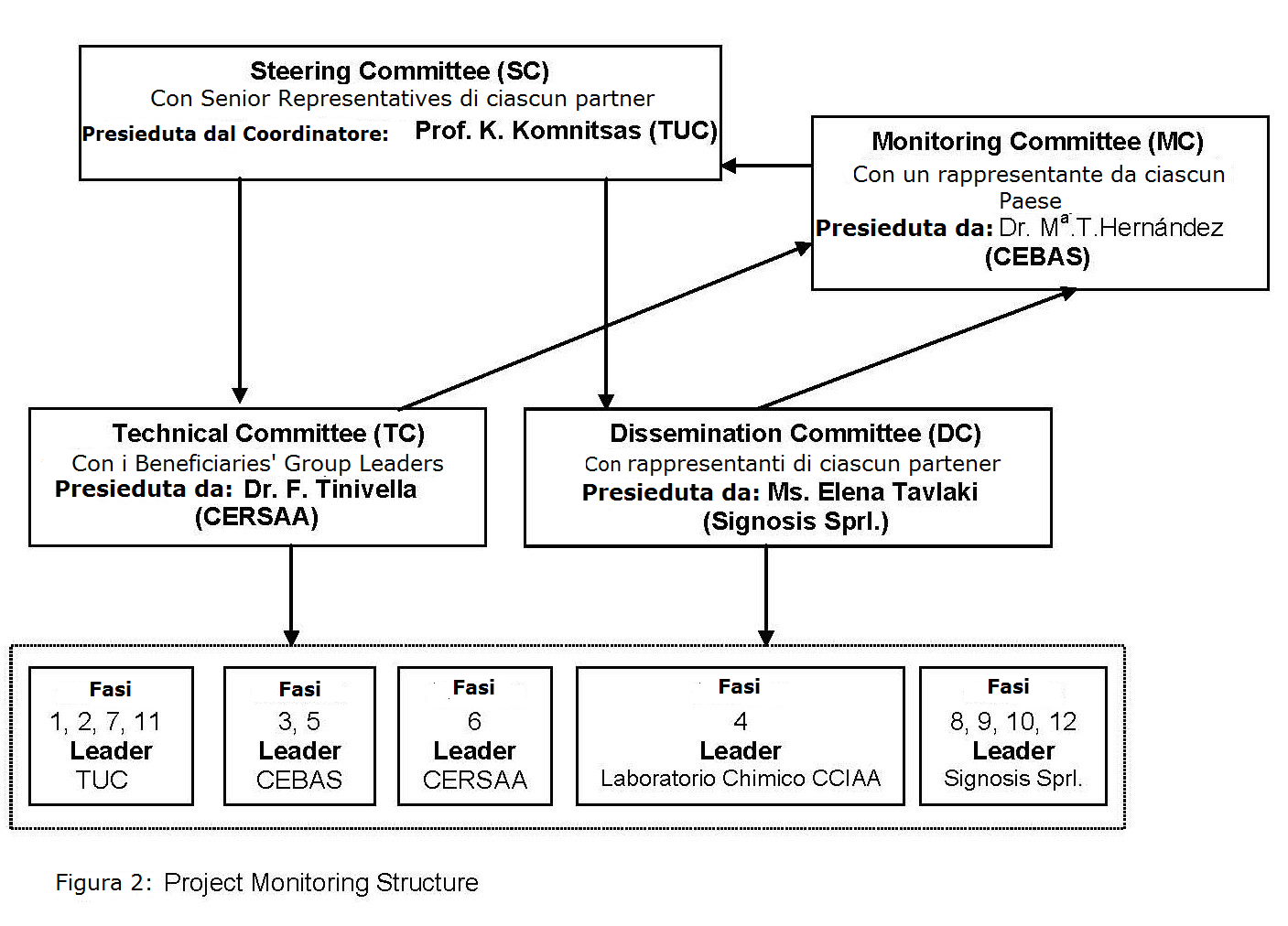 – Technical Committee (TC): è composta dai Leader del Gruppo dei Beneficiari. Sarà presieduta da un Direttore Tecnico (Dr. Federico Tinivella-CERSAA). Le responsabilità della TC includono: definizione, allocazione e supervisione di tutte le fasi e della loro messa in pratica, implementazione delle fasi secondo il calendario, presentazione dei risultati, convergenza delle tappe principali, completamento dei protocolli entro i termini e relazione alla e al Coordinatore. Per temi riguardanti il monitoraggio la TC fa capo alla MC. La TC potrà, se necessario, prendere decisioni strategiche per conto del progetto. La TC contatterà spesso i Capi Gruppo per monitorare l’avanzamento, identificare eventuali problemi e prevedere misure correttive se necessarie.